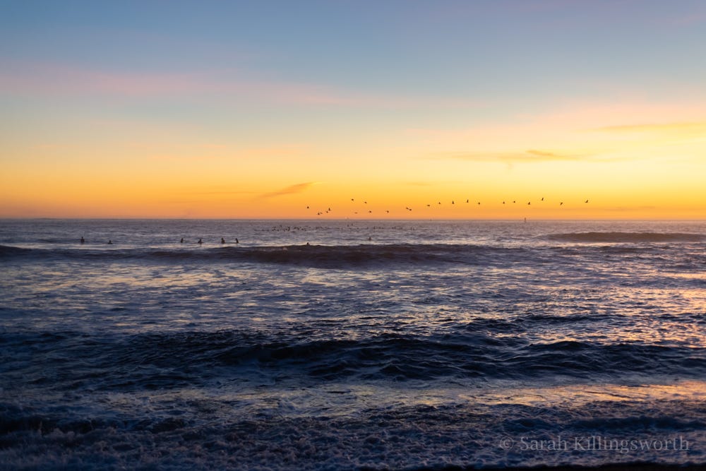 Horizontal slide, holding the camera out in front of you and swinging it from left to right or from right to left. This is my preferred move when there are horizontal elements in the landscape, like a river bank, a line of hills, clouds, a sunset, or my favorite, waves at the beach. A variation on this is to flick your wrist, so that the camera stays in front of you but the viewfinder flicks from left to right, pivoting on the lower right corner (I am right handed). Another variation is to move in a slight arc as you go from one side to the other.